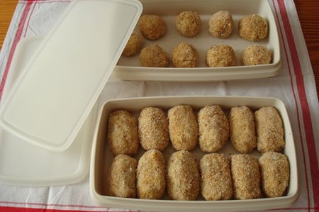 Ir cogiendo porciones de masa (se puede cortar con un cuchillo en tiras de unos dos tres centímetros de anchas por cuatro o cinco de largas) y con la mano o ayudados de una cuchara darle su característica forma (mas fácil y original es hacerlas redondas), e irlas pasando sucesivamente por la harina, huevo y pan rallado.