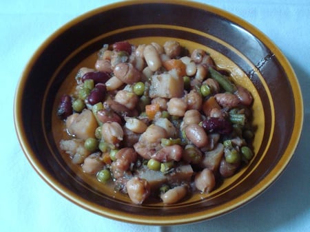 El día anterior poner a remojo todo junto, los garbanzos y las judías blancas, rojas y pintas.