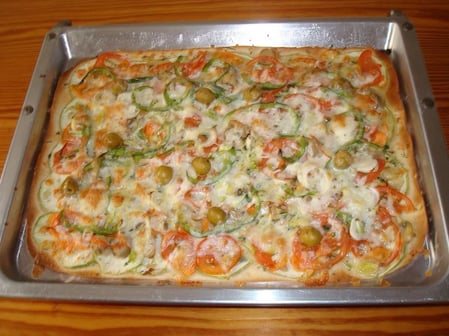 Con el rodillo extender la masa para hacer una base muy fina y sobre esta espolvorear el perejil y el ajo, e ir cubriendo por capas con las rodajas de bubango, de zanahoria, la cebolleta, los champiñones, el tomate, las tiras de pimiento y las aceitunas, condimentar con sal pimenta y orégano al gusto.