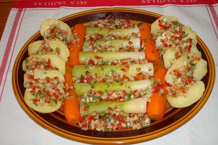 En la fuente de servir disponer el puerro, las zanahorias y las patatas cortadas en mitades, regar por encima con la vinagreta.
