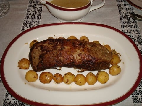 El día anterior se pelan los ajos y se filetean a lo largo, con ellos se frota el redondo y se dejan adheridos. Se salpimienta y se rocía con un poco de aceite. Se deja en reposo unas doce horas.