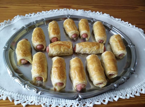 Ponemos un trozo de salchicha en el extremo de cada rectángulo de masa, con un pincel, pintamos con huevo batido el otro extremo del rectángulo de masa y procedemos a enrollar la salchicha, hasta cerrar y pegar el canutillo.