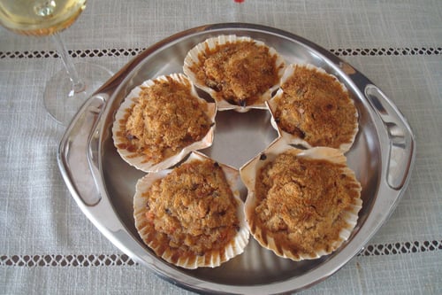 Cubrir las vieiras en sus conchas con el sofrito y una capa delgada de pan rallado por encima, añadir unas gotas de aceite de oliva y meter al horno, previamente precalentado a 180º durante unos 15 minutos, dar 3 minutos de gratinado y listo.