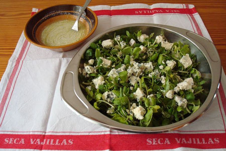 Añadir la vinagreta a los berros y colocar por encima los trozos de queso.
