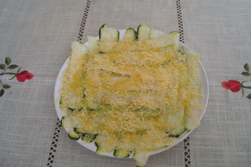 Colocar las láminas recién cortadas del calabacín, en una fuente o plato grande, espolvorear con la pimienta recién molida (al gusto), regar con un poco de aceite de oliva extra y rallar