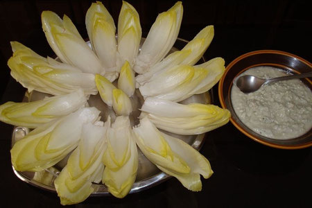 Cortar los tallos de las endivias y separar las hojas, lavar, secar y colocar en una bandeja.