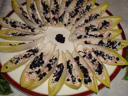 Poner un poco de esta mezcla en cada hoja de endivia y decorar con las huevas de lumpo.