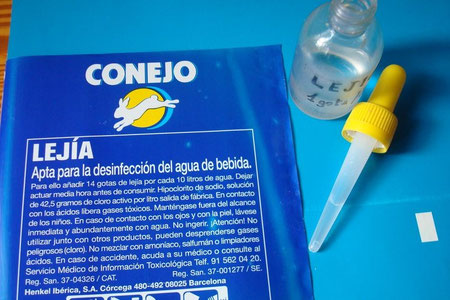 Normalmente utilizo un recipiente hondo, en el que pongo una gota de lejía por cada litro de agua, sirviéndome de un cuentagotas como el de la fotografía (reciclado de un frasco de suero fisiológico), introduzco las verduras (que queden cubiertas por el agua) dejándolas en remojo unos diez minutos, las saco y vuelvo a lavar con abundante agua, para eliminar los restos de lejía, tras secarlas ya están listas para su utilización.